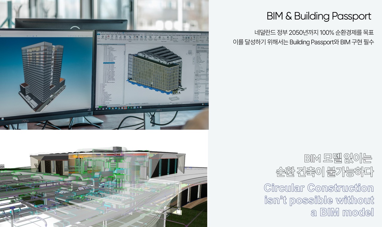 책에서는 암스테르담의 ‘엣지 암스테르담 웨스트EDGE Amsterdam West’, 에인트호번의 ‘자전거 주차시설’, ‘Circl ABN AMRO 파빌리온’ 등 씨아이이가 진행한 다양한 프로젝트 사례들을 통해 순환건축의 원리와 효과를 생생하게 전달한다. 이들 사례에서 주목할 점은 건물의 수명과 이의 일시적 속성을 인정하고 해체와 재활용을 설계 초기부터 고려했다는 점이다. 건물 해체와 재활용까지 고려한 해체 계획(Deconstruction Plan)’, 건물의 모든 구성 요소와 예상 수명, 관리 지침을 담는 ‘빌딩 패스포트 (Building Passport)’, 그리고 이를 3D 모델로 구현해 건물의 전 생애주기와 이에 따른 정보를 담고 궁극적으로 건물에 관한 모든 의사결정을 돕는 ‘BIM 모델(BIM Models)’의 중요성 등 주요 혁신 개념을 소개한다.